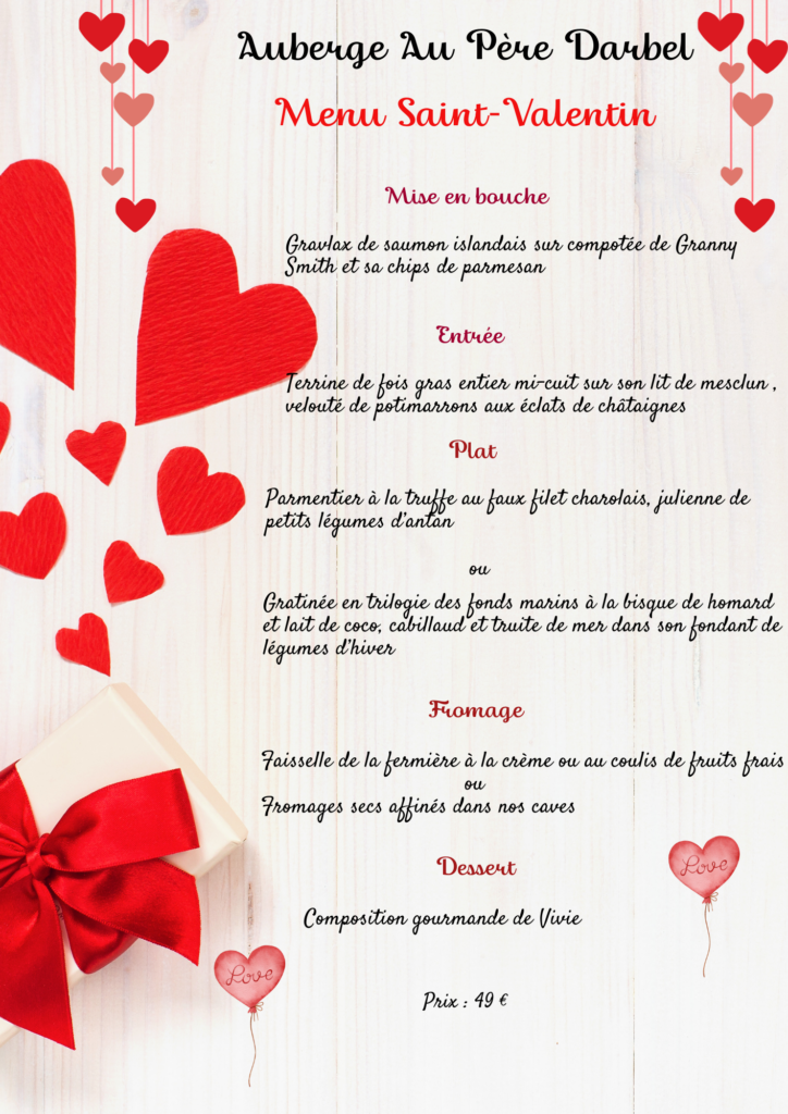 Venez partager un moment romantique au coin du feu et savourez notre menu spécial Saint-Valentin à l’Auberge au Père Darbel !